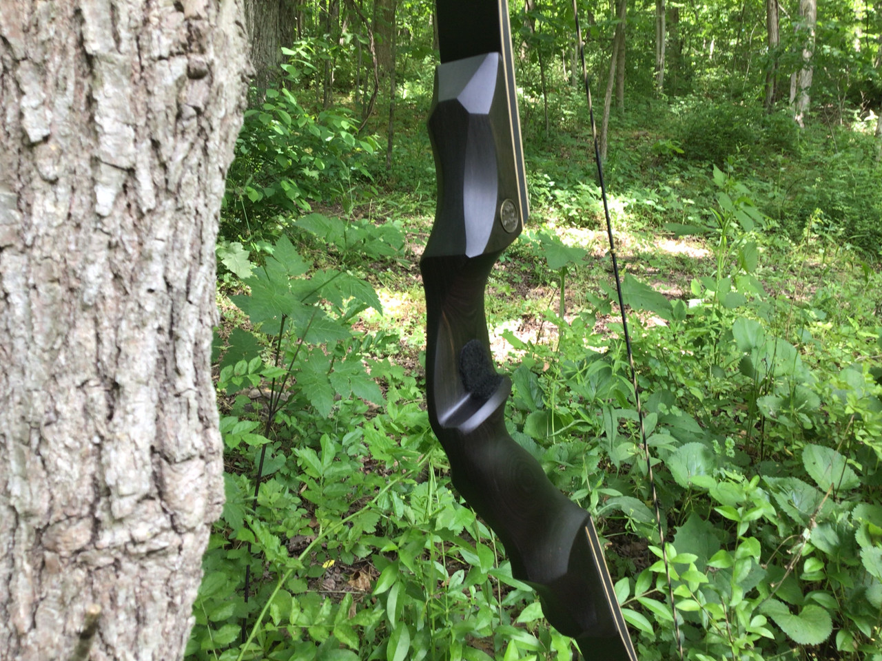 This bow is a Black Beauty! The riser is black with multi-layered diamondwood. Quiet with little to no hand shock. The limbs have a Bamboo core with black glass overlay. There is dark hardwood in the limb wedge. The limb tips are reinforced for any modern string. The small tips reduce hand-shock and give speed. The 16" riser with long, sweeping limbs are attached on the belly side for the added bonus of making this bow a smooth, sweet shooter! The higher brace height gives you the ease of draw and more forgiving of release. It weighs 2.5 pounds!! It has a nice feeling, comfortable grip. This bow comes with a Flemish Dyneema string** (high performance material). Used for its, durability, strength and speed. This great price includes the bow set up with a nocking point, silencers, and the shelf and side material installed. We recommend using one of our large end bow stringers to string up this bow, (purchased separately for $15.00.) NOW INCLUDED!!